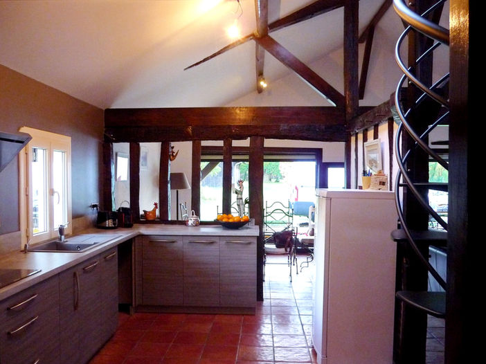 L'objectif de ce projet visait la rénovation de la cuisine et le remplacement d'un escalier. Les éléments d'origine étaient peu fonctionnels et encombrés par un espace mansardé inutilisable au-dessus de la cuisine dont le plafond était très bas. Pour désencombrer le tout, le plancher de la mansarde a été déposé ainsi que l'escalier bois. Un nouvel escalier métallique en colimaçon et de nouveaux meubles de cuisine ont été installés. La double hauteur du séjour a été récupérée, ce qui a permis un gain important en luminosité, en confort et en esthétique.